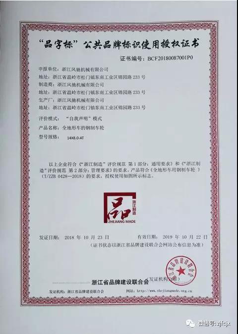 2018年10月榮獲浙江省品牌建設聯合會頒發的“品字標”公共品牌標識使用授權證書