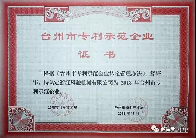 2018年11月榮獲臺州市知識產權局頒發的“臺州市專利示范企業”